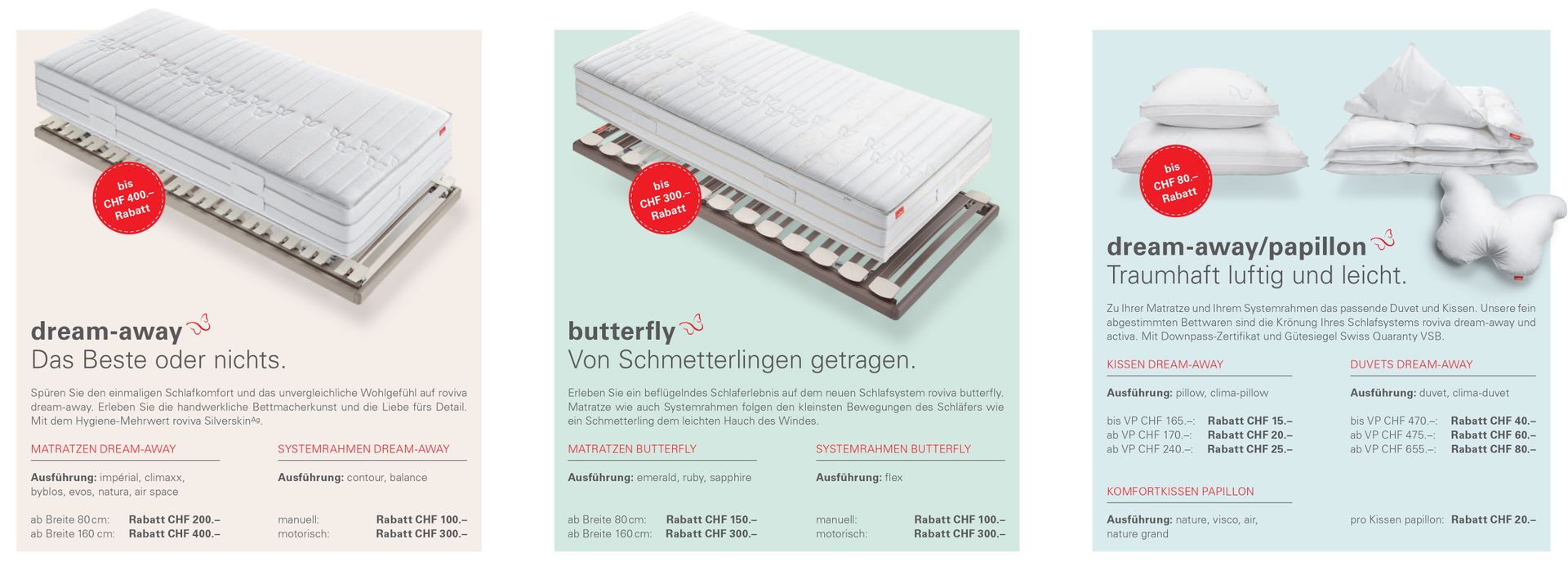 Profitieren Sie jetzt von den einmaligen Preisvorteilen beim Kauf Ihrer neuen Roviva Matratze und Ihres neuen Systemrahmens sowie bei Ihren neuen Kissen und Duvets.