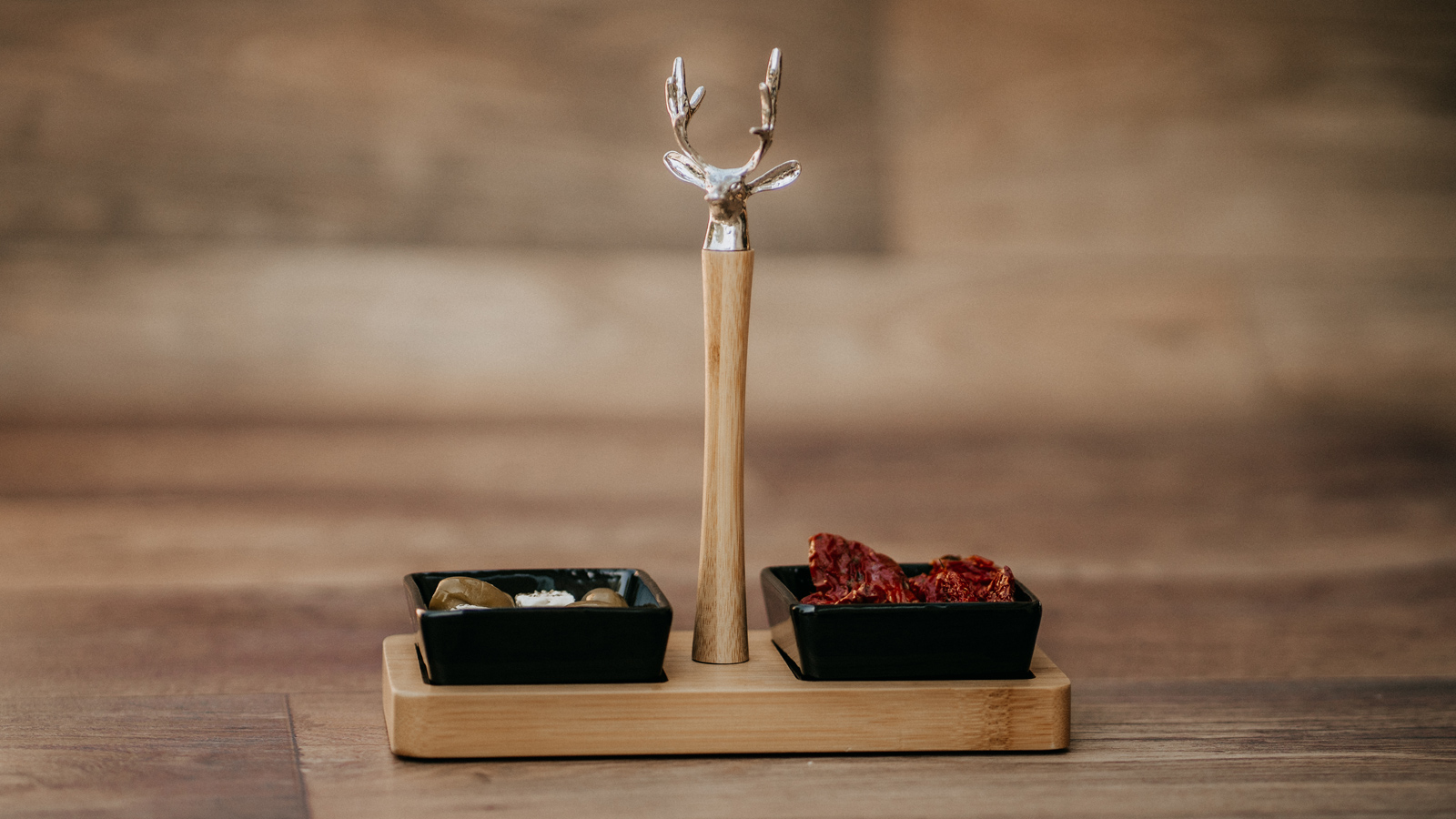 Bambusuntersetzer mit silber glänzenden Hirsch-Haltegriff