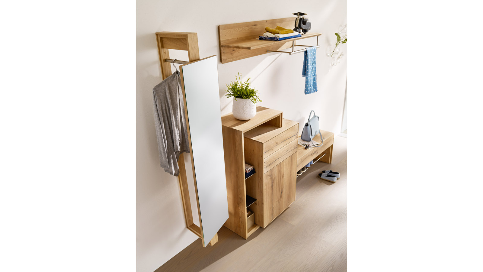 Hängegarderobe mit schwenkbarem Spiegel und Kleiderstangeohne Deko