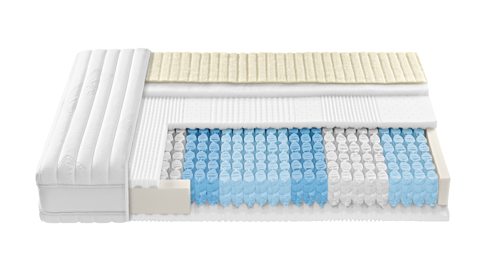 - Kern: 7-Zonen-Taschenfederkern aus veredelten Sprungfedern, einzeln eingesetzt in Boxspringtaschen