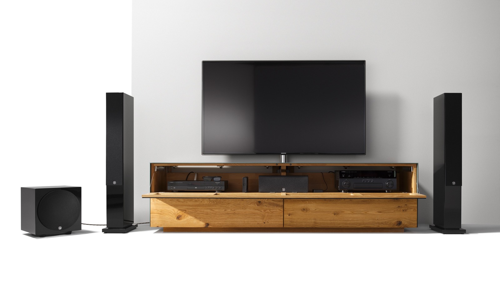 • Front: Eiche wild massiv geölt / Akustikstoff schwarz